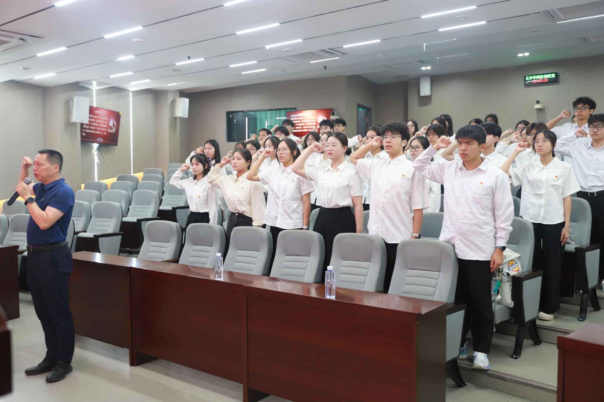 “我志愿加入中国共产党……”在张骁副院长的领誓下,46名新党员在鲜红党旗下,高举右拳,以青春之名许下为共产主义奋斗终身的郑重承诺。