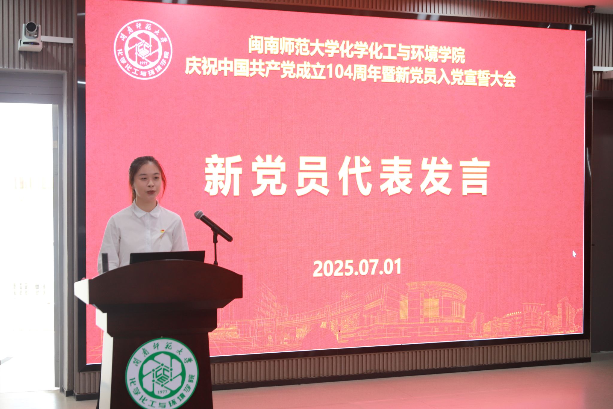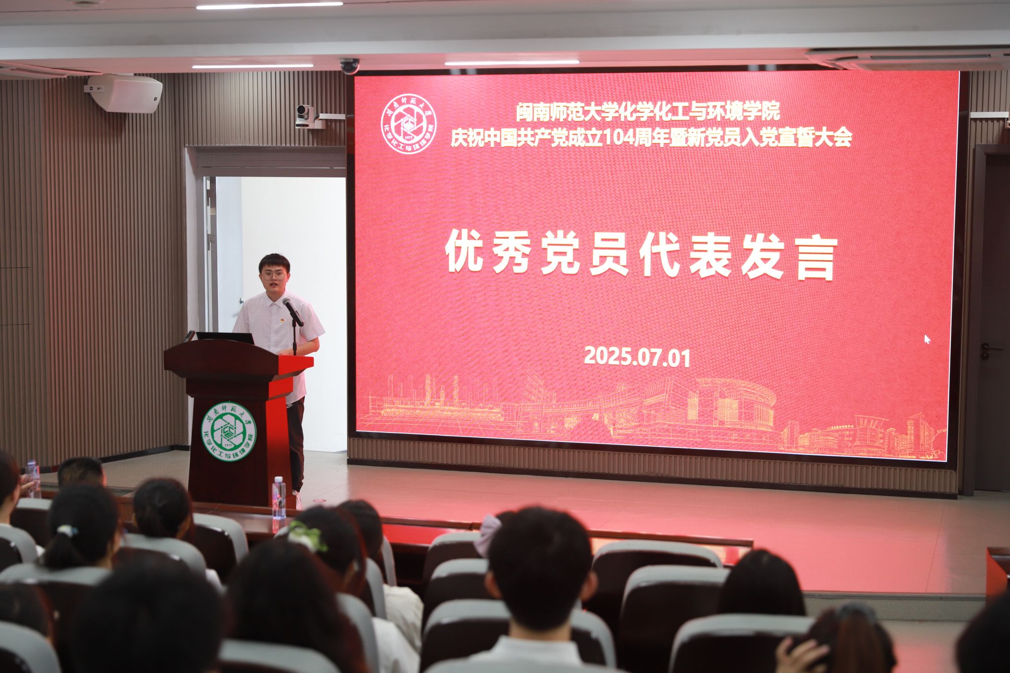 优秀党员代表2024级分析化学专业硕士研究生吴端凯同志发言。他表示,党组织对他思想、学习和生活上的关心与指导,是其转化为全心全意为同学们服务的源动力,他号召新发展党员以实际行动继续从思想上、行动上入党,用一生去践行共产党员的初心使命。