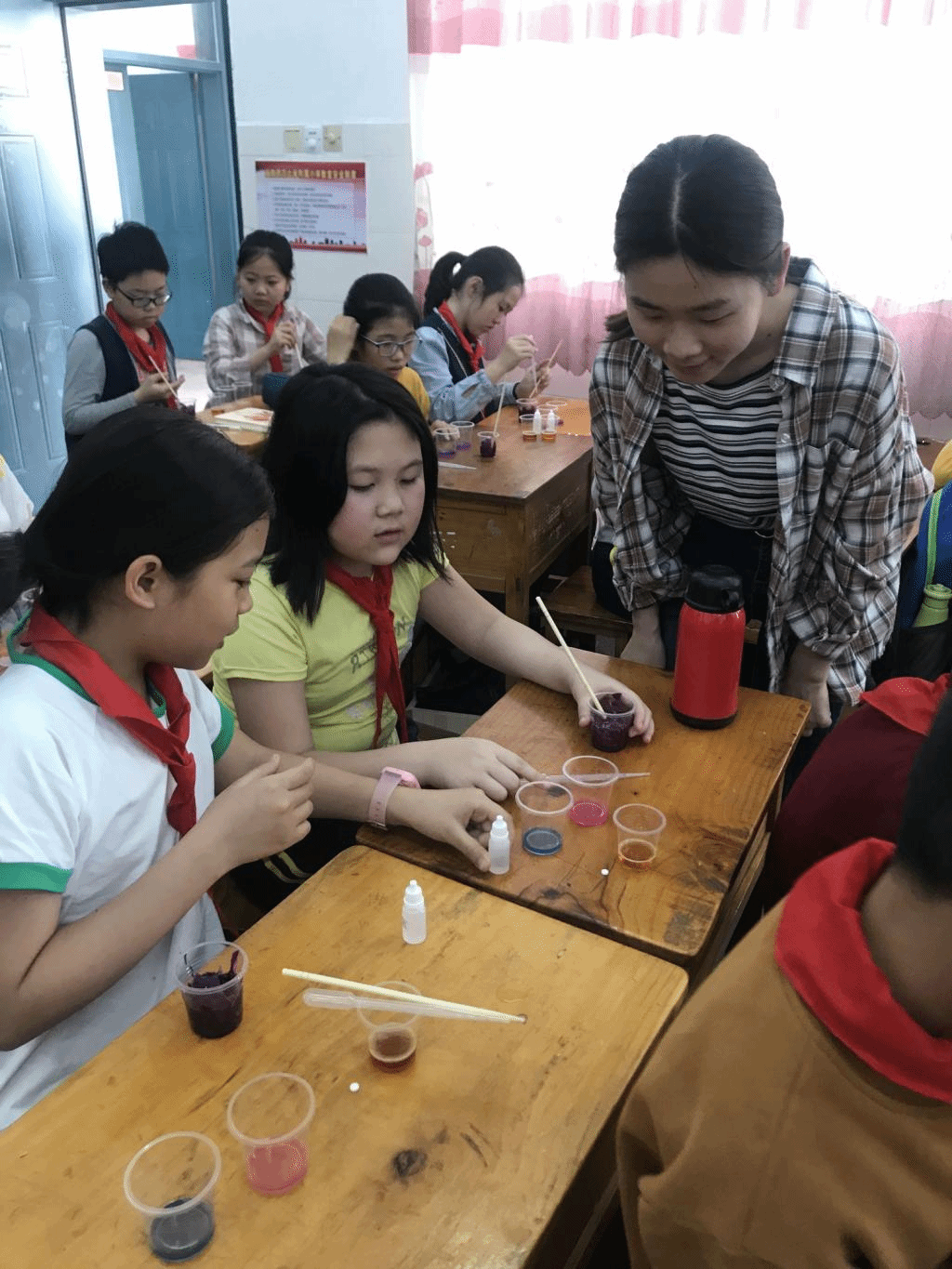 志愿者们向学生们分发了实验药品及仪器,党支部成员许飞凌同学向小学生们讲解“紫甘蓝变色”和“碘伏遇维C褪色”小实验,神奇的变色反应成功点燃了课堂的氛围。小学生脸上的喜悦和幸福是这次党日活动最大的收获。