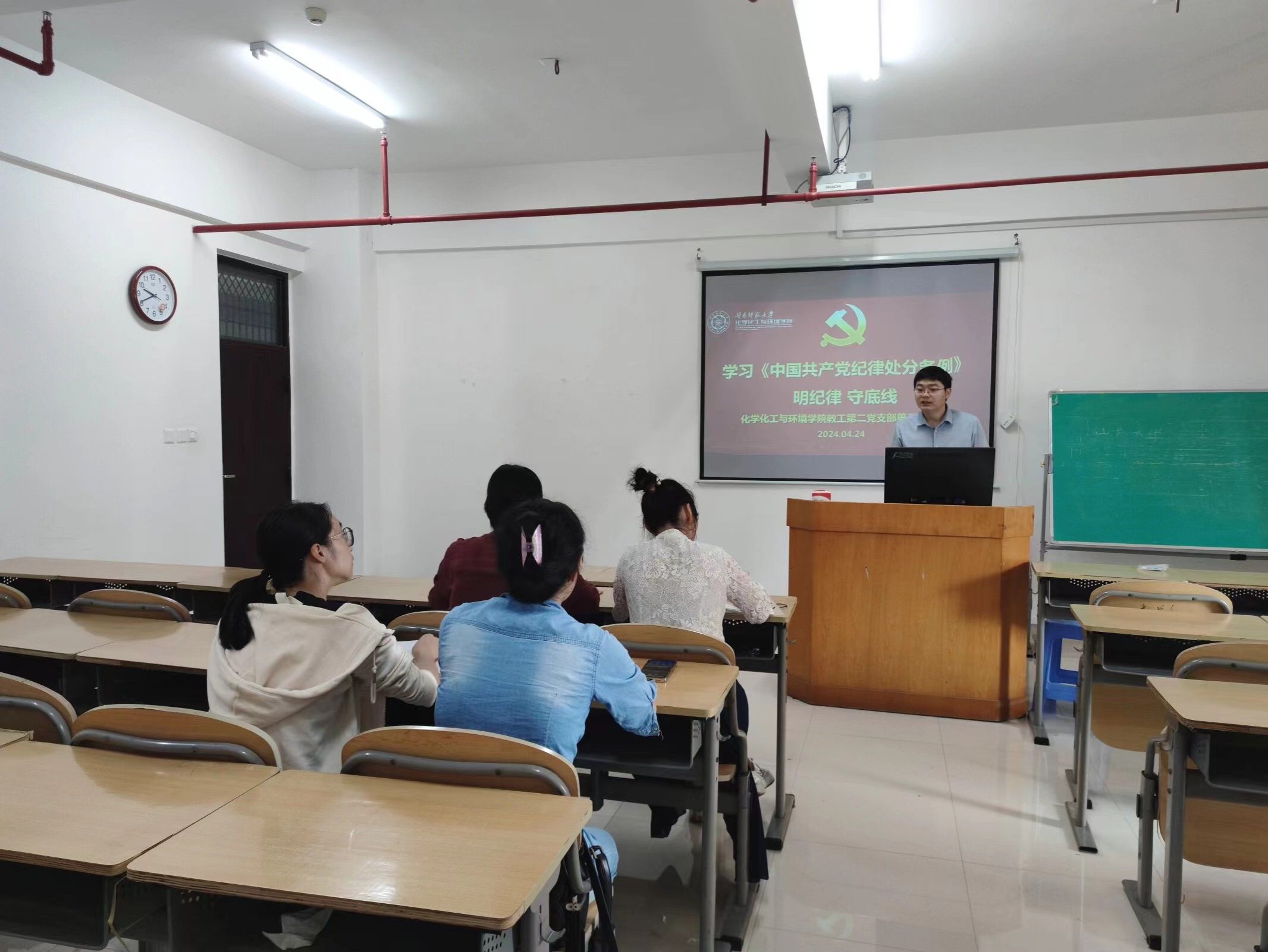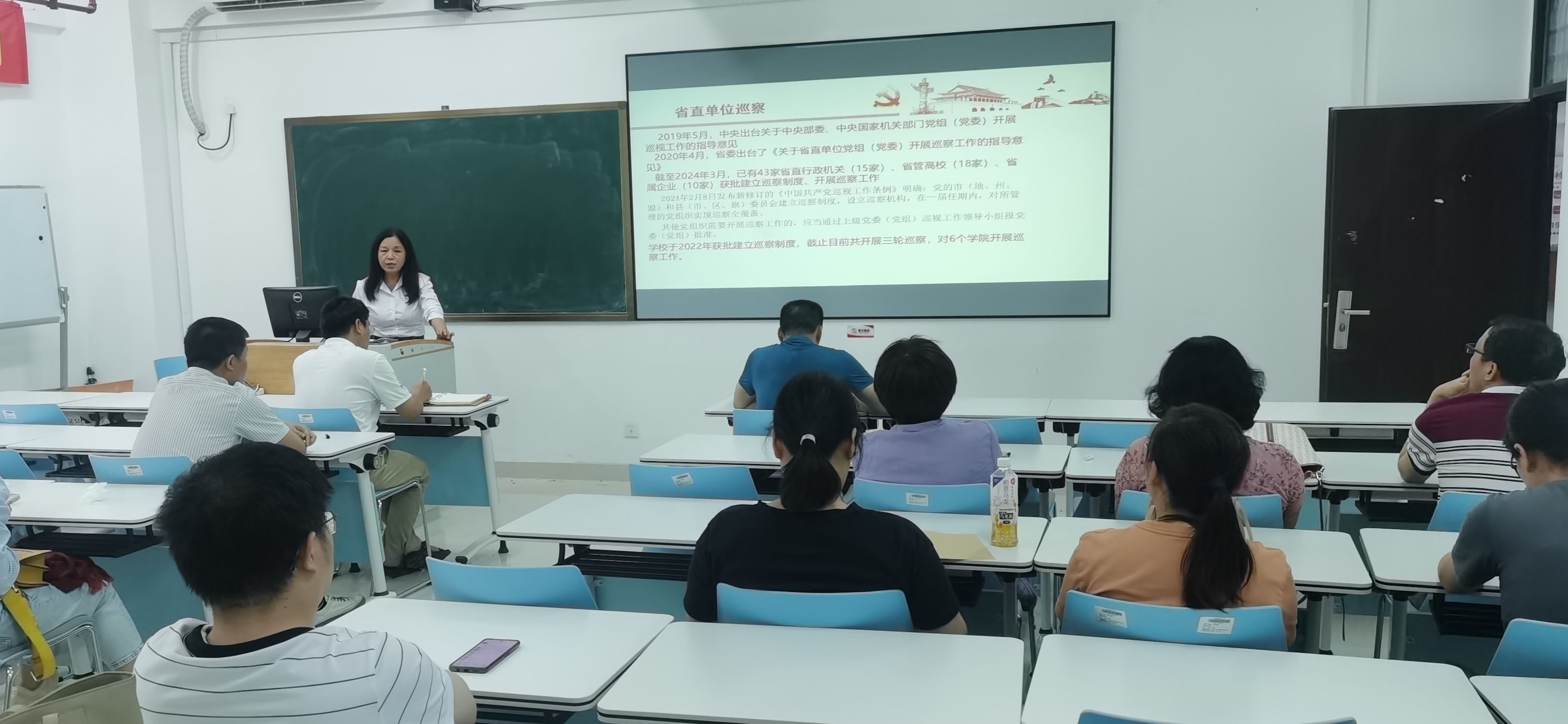 近日,教工第一党支部邀请联系指导的校党委巡察办蔡文联组长为大家作了题为《深化思想认识,提高政治站位,全面领会政治巡视巡察的新要求》专题党课,从中国共产党巡视巡察历史、新修订《条例》学习解读、《条例》运用校内巡视巡察等方面讲述了守党纪的重要性,强调要发挥“头雁”效应,切实履行主体责任,时时严格自律,处处以身作则,时刻督促自身严格遵守党章党规党纪,严格按党的原则、纪律、规矩办事。