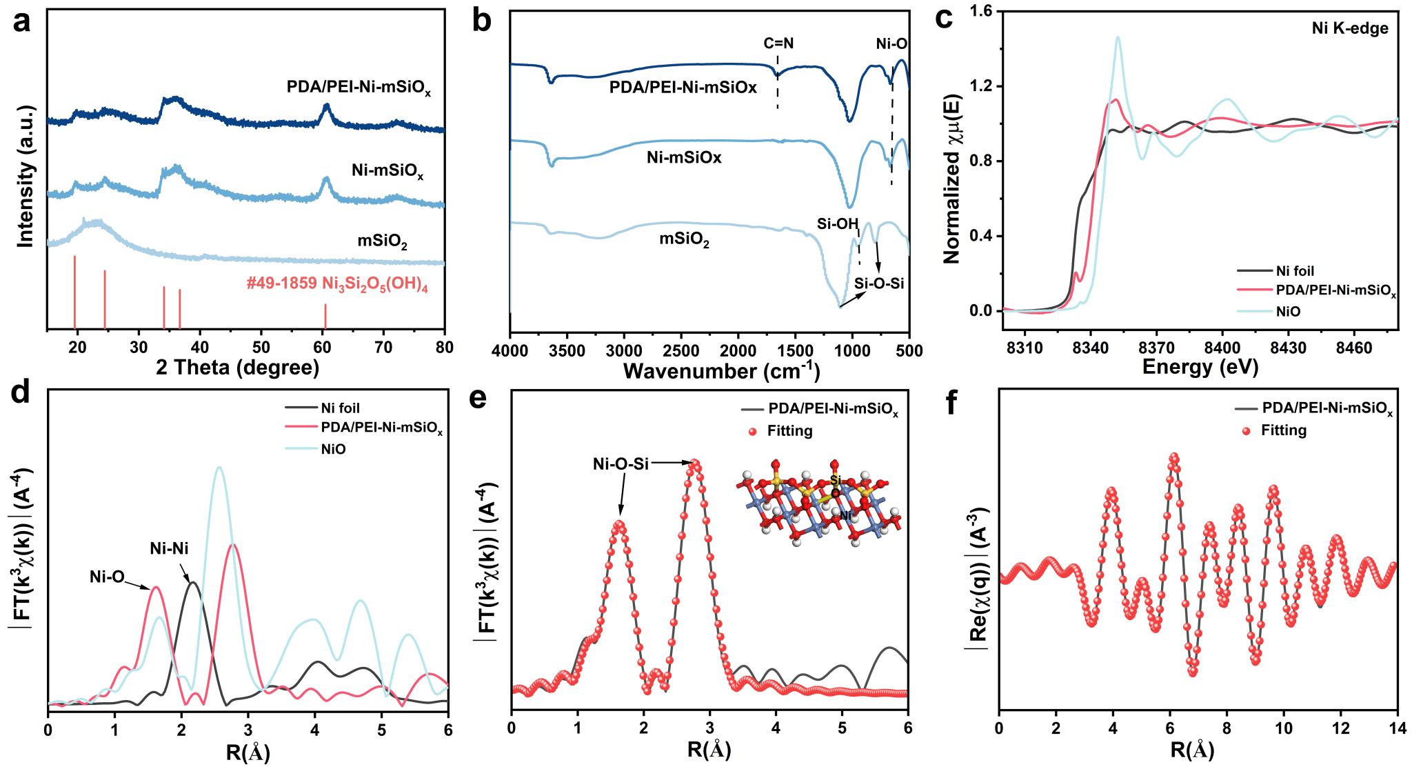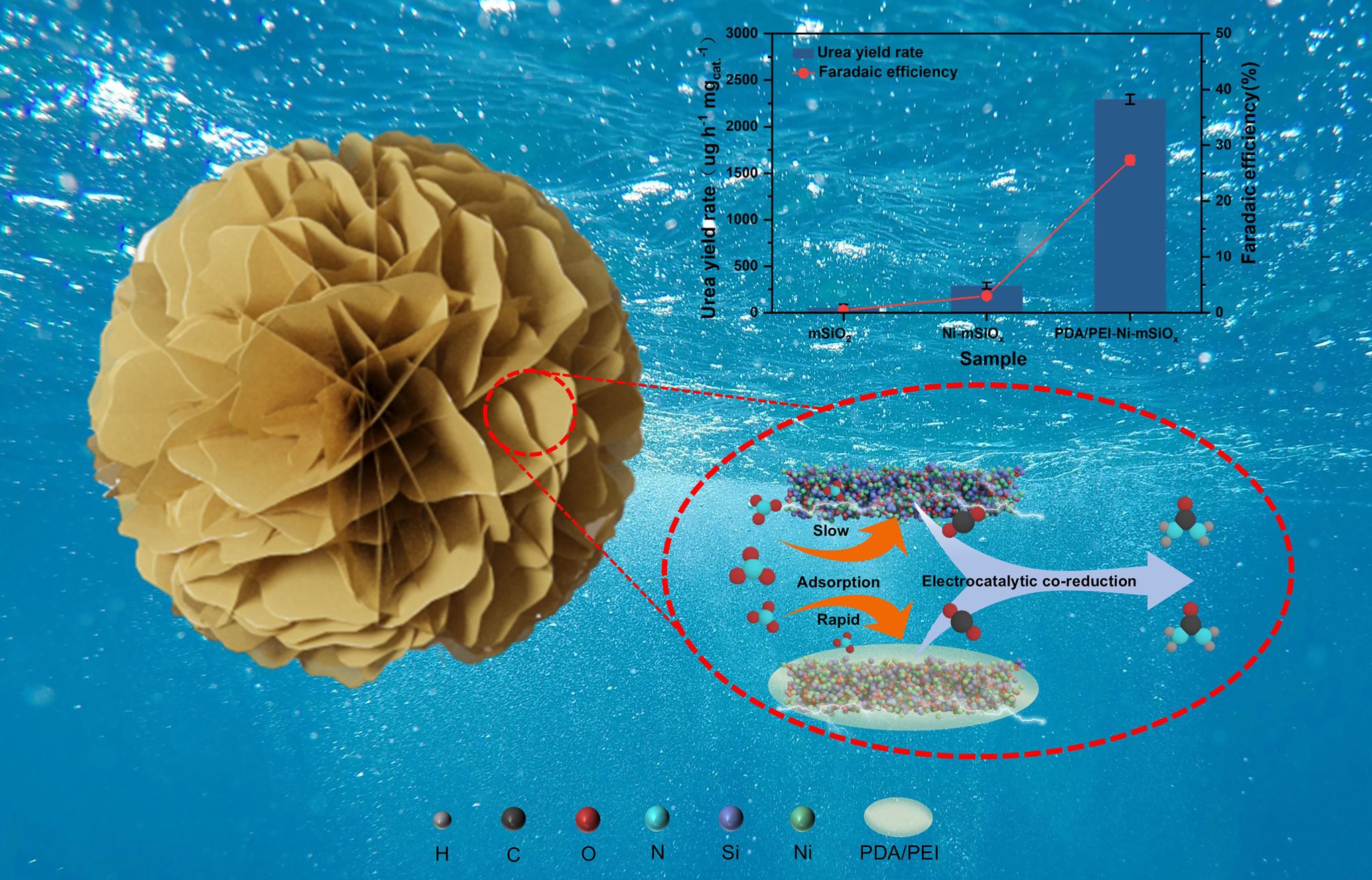 团队创新性地采用聚多巴胺与聚乙烯亚胺对镍基介孔氧化硅进行协同表面修饰,构建出具有花瓣状中空结构的复合催化剂。该结构不仅显著提高了比表面积,更通过双聚合物的协同效应,优化了催化剂表面电子结构,大幅提升了吡咯氮和吡啶氮等活性物种的比例,有效促进了C−N键的形成。结果表明,该催化剂在−1.2 V(相对于可逆氢电极)电位下,尿素产率高达2513 μg h−1 mgcat−1,尿素选择性为54.2%,性能优于大多数已报道的尿素电合成催化剂。尤为重要的是,该催化剂在连续运行39小时后仍能保持90%以上的初始活性,展现出卓越的长期稳定性。通过同位素标记实验与多种表征手段,研究团队证实了尿素产物来源于CO₂与NO₃⁻的协同还原,并揭示了双聚合物修饰在稳定活性位点、促进反应动力学中的关键作用。
