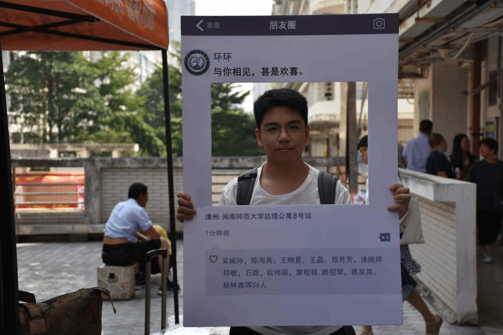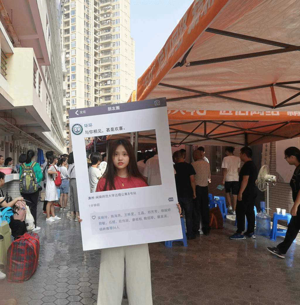 此外,学院还根据00后学生特点,专门设置了迎新合影活动——“我与环环的第一次见面”。活动以学院院徽为主体设计制作了环环的微信朋友圈合影板,新生们纷纷参与合影留念活动,在环环的朋友圈里展现他们开学第一天的最美笑容。
