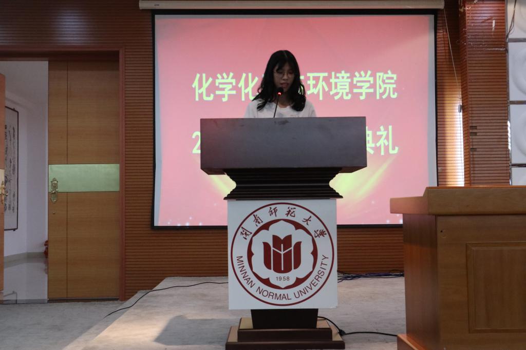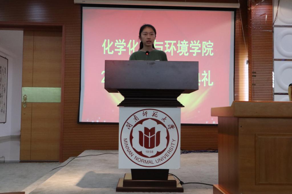 新生代表2018级科学教育专业的罗炜洁同学向大家分享了自己来到闽南师大的感受,并代表全体新生表达了珍惜时光、发奋图强、为化院争光的决心和信心。