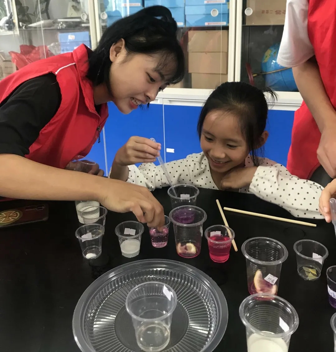 最后在讲解完有趣的酸碱变色原理之后,志愿者们让小朋友们亲手实践操作,探索其中的奥秘。小朋友们都不禁感叹:“太好玩,太神奇了!”志愿者们也将自己所学到的理论知识,结合生活实际,用通俗的语言让小朋友们更好的理解实验所蕴含的科学知识。一些长期参与晓禾园活动的小朋友们,在实验过程中,举一反三,积极提出自己的看法,我们已经感受到了最初播种在他们心中的那颗科学的种子,正在生根发芽。