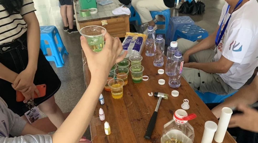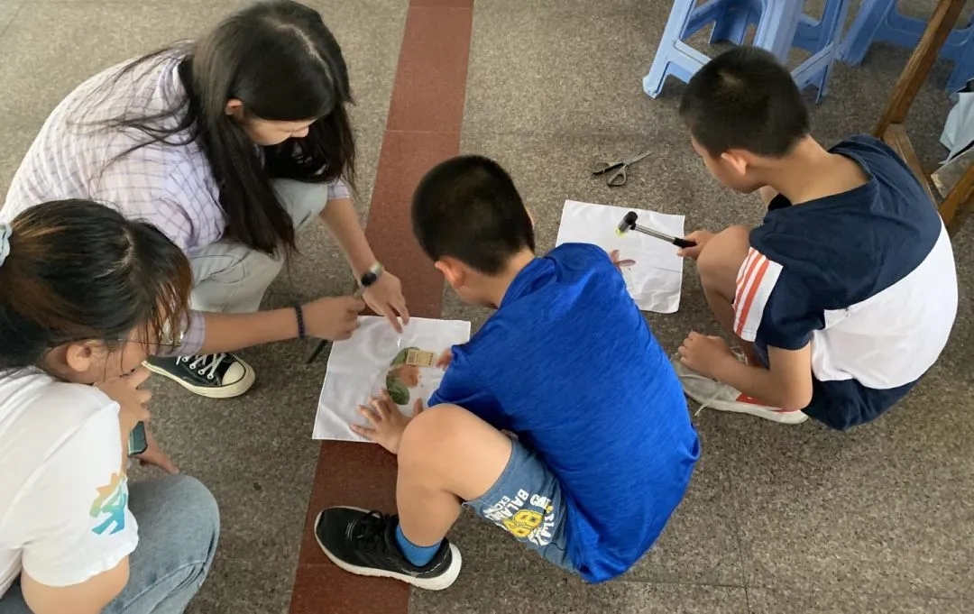 本环节不仅让同学们亲自动手“海底岩浆”实验,他们还用植物枝叶“拓染”出了独属于自己的丝巾,让参与者自己动手实验,在了解化学知识的同时也可以体会化学的乐趣。