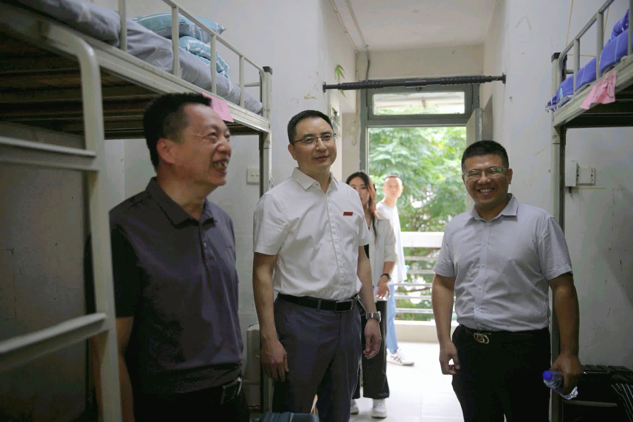 新生开启大学新篇之际,为落实教育部关于加强和改进高校管理、提高学生安全意识和生活质量的指示,9月5日,院党委副书记裴新星老师、团委书记杨文亮老师及新生辅导员张尚达老师走访学生宿舍。学院领导老师认真审视宿舍的设施设备是否齐全,床铺是否坚实稳固,卫生间与浴室是否整洁如新。检查中,他们偶遇提前熟悉校园的新生家长,热情交流,倾听期望与担忧,询问对宿舍条件的看法建议,并表示学校会不断改善设施,提供更舒适居住环境。