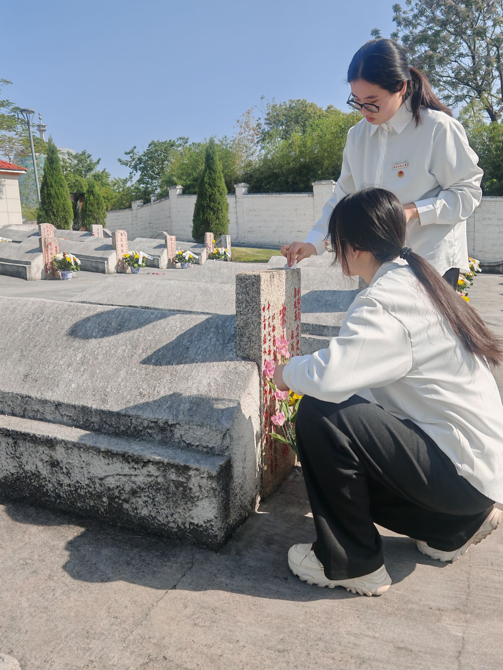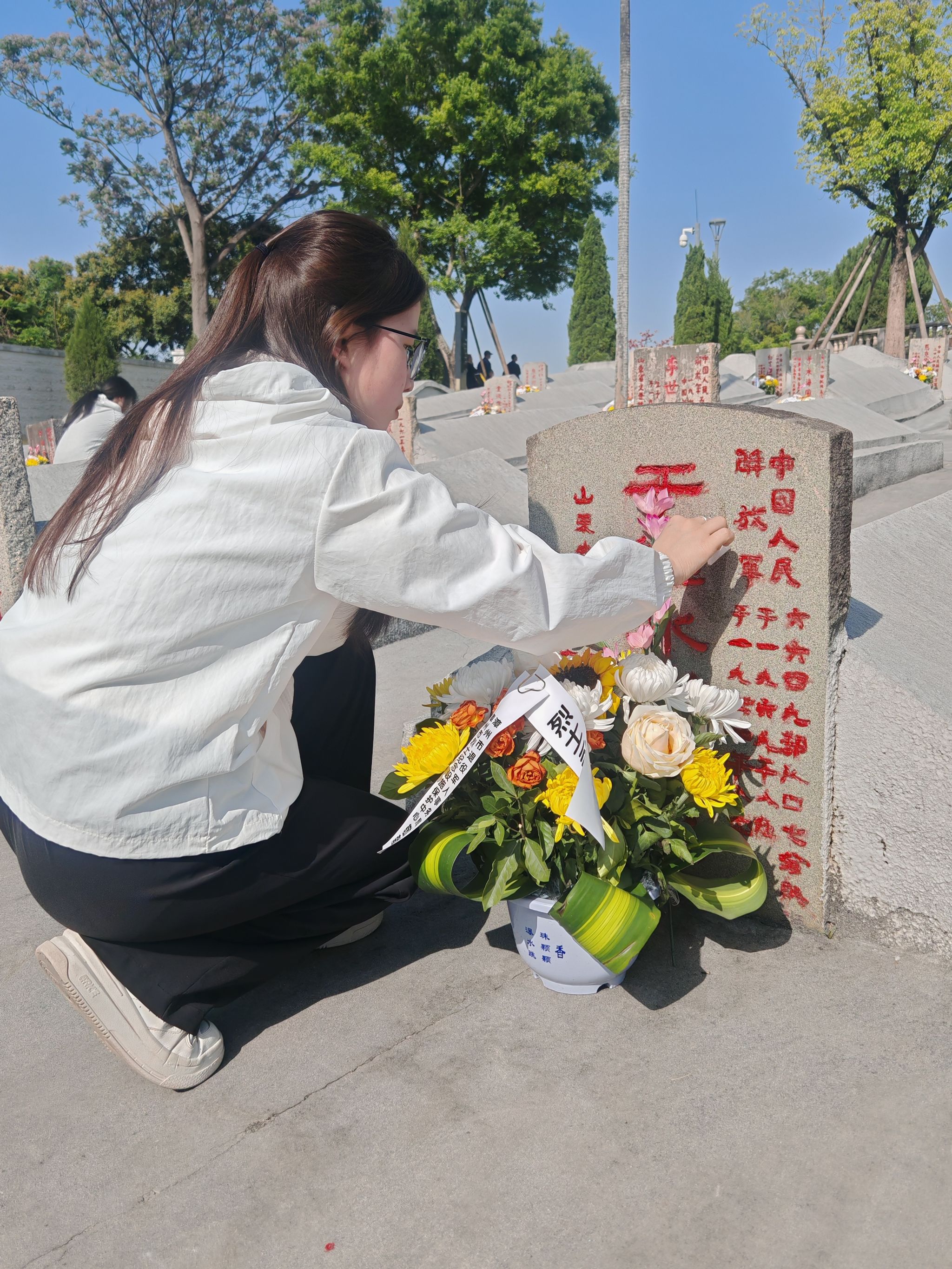 “白菊映忠骨,清风寄远思”。学员们手捧白菊,向烈士墓碑深深三鞠躬。将一束束鲜花敬献在墓碑前,以表达对革命先烈的深切怀念和无限敬仰。