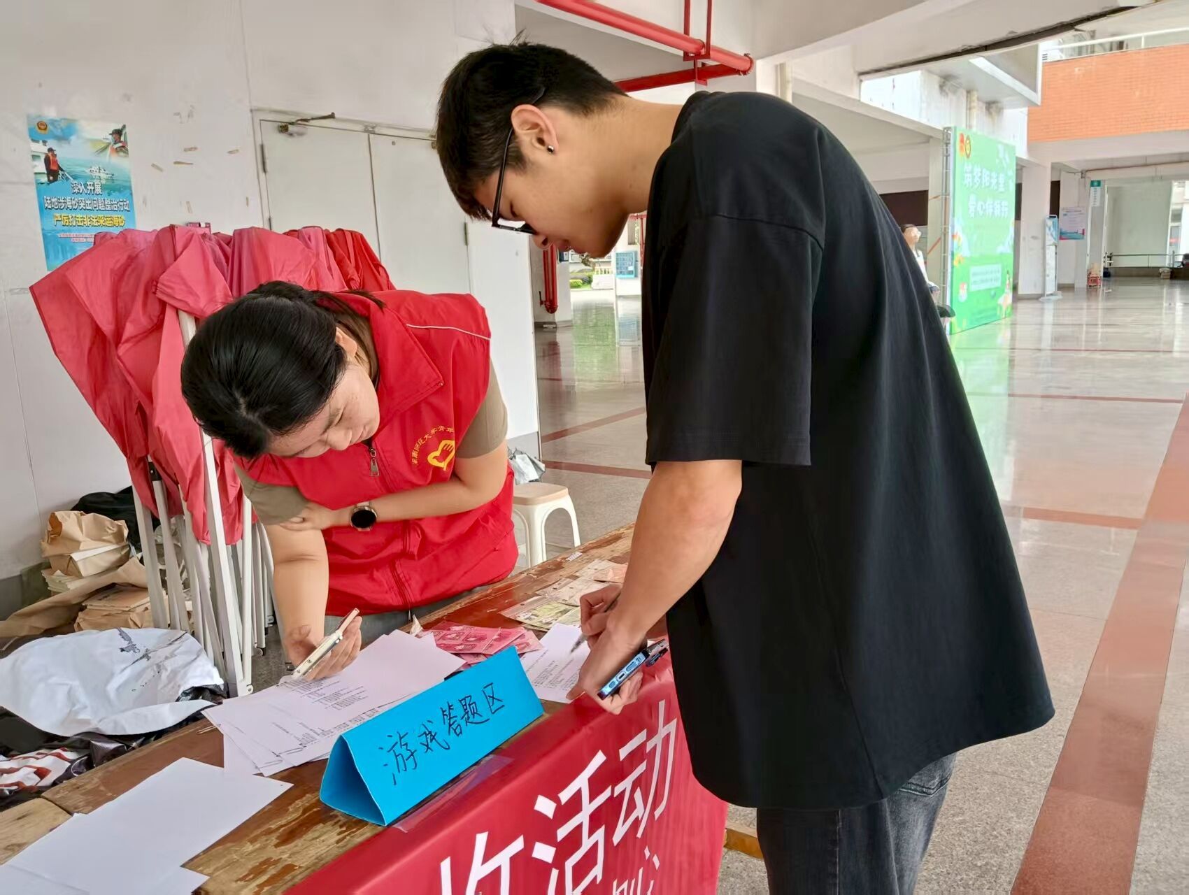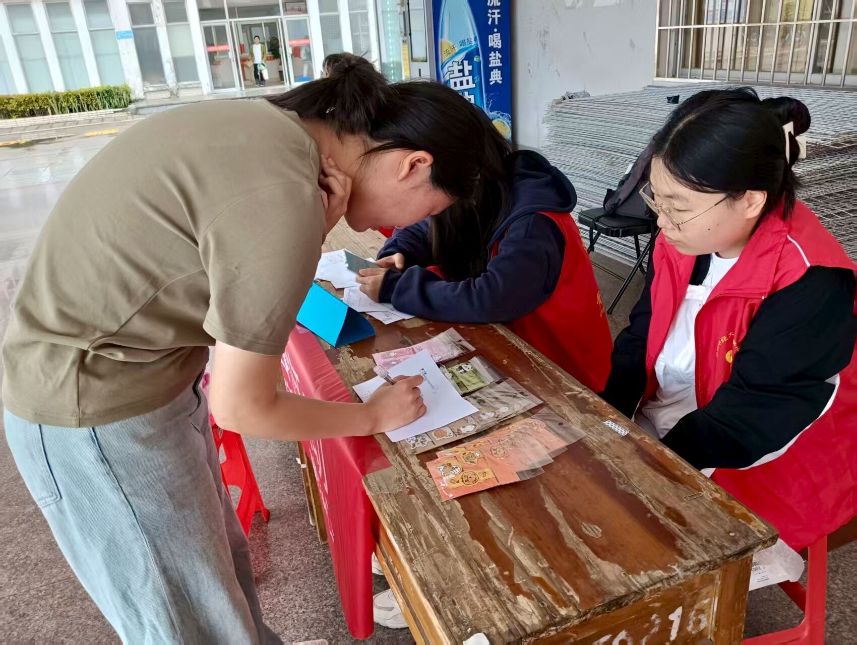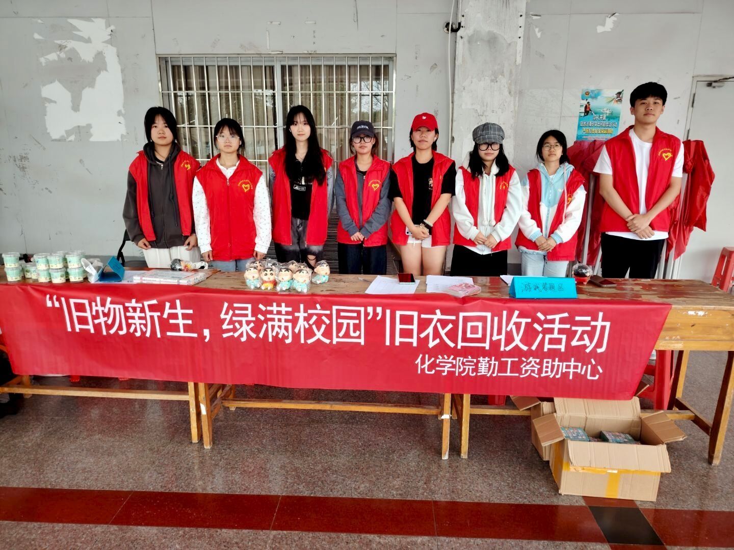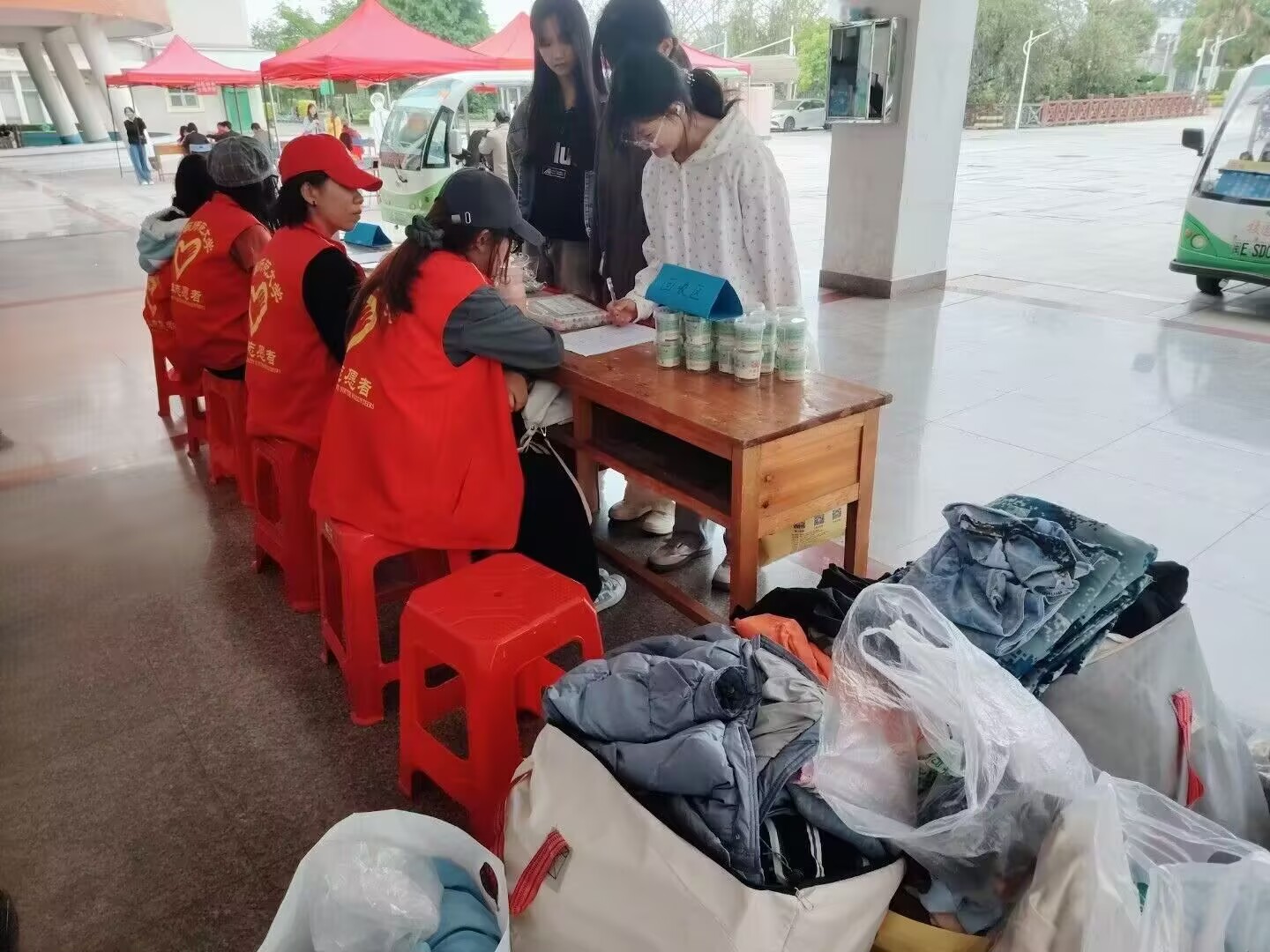 活动当天,志愿者们早早抵达现场布置场地,以饱满热情开启旧衣回收行动。随着活动启动,同学们纷纷携带闲置衣物前来捐赠,现场涌动着暖流与希望,志愿者们仔细登记捐赠者的信息,并送上纪念小礼品。另有一队志愿者背上环保袋穿梭楼宇,化身"绿色使者"上门回收。