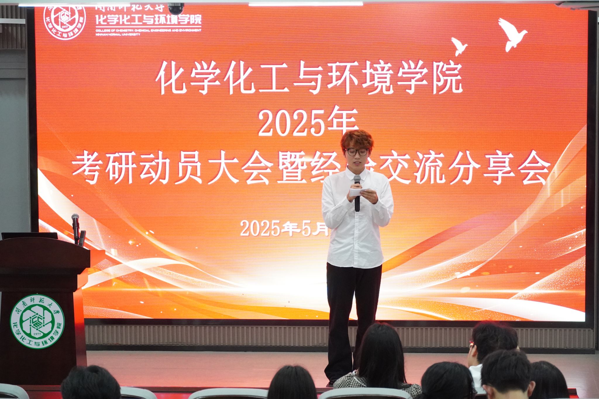 经验分享环节,2025届优秀考研学子代表:刘敏、胡乔森、于熊玲、郭启鸿依次上台,结合自身考研经历进行分享。