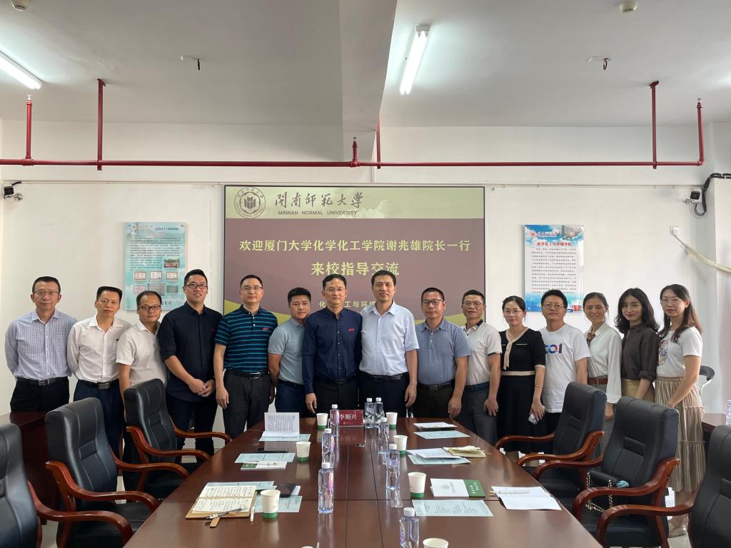 的发展历程、专业建设、学科发展以及博士点申报准备等概况,并期待双方在学术交流、师资引育、人才培养等方面的广泛深度合作。接着,厦大化院党委副书记刘俊杰介绍了厦大化院的基本情况。最后,与会人员围绕博士点建设、支撑团队建设、科技进步奖申报、科研项目申请指导等内容进行热烈讨论。交流中,谢兆雄认为闽南师大与厦大同处闽南地区,地缘关系深厚,两院双方学科力量各有特色,拥有广阔的合作空间,应以常态化高水平交流为契机,在科技成果转化、产业应用等方面展开更深层的科研合作。