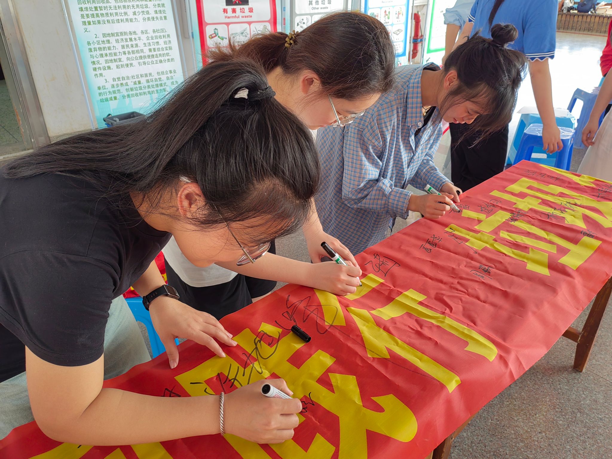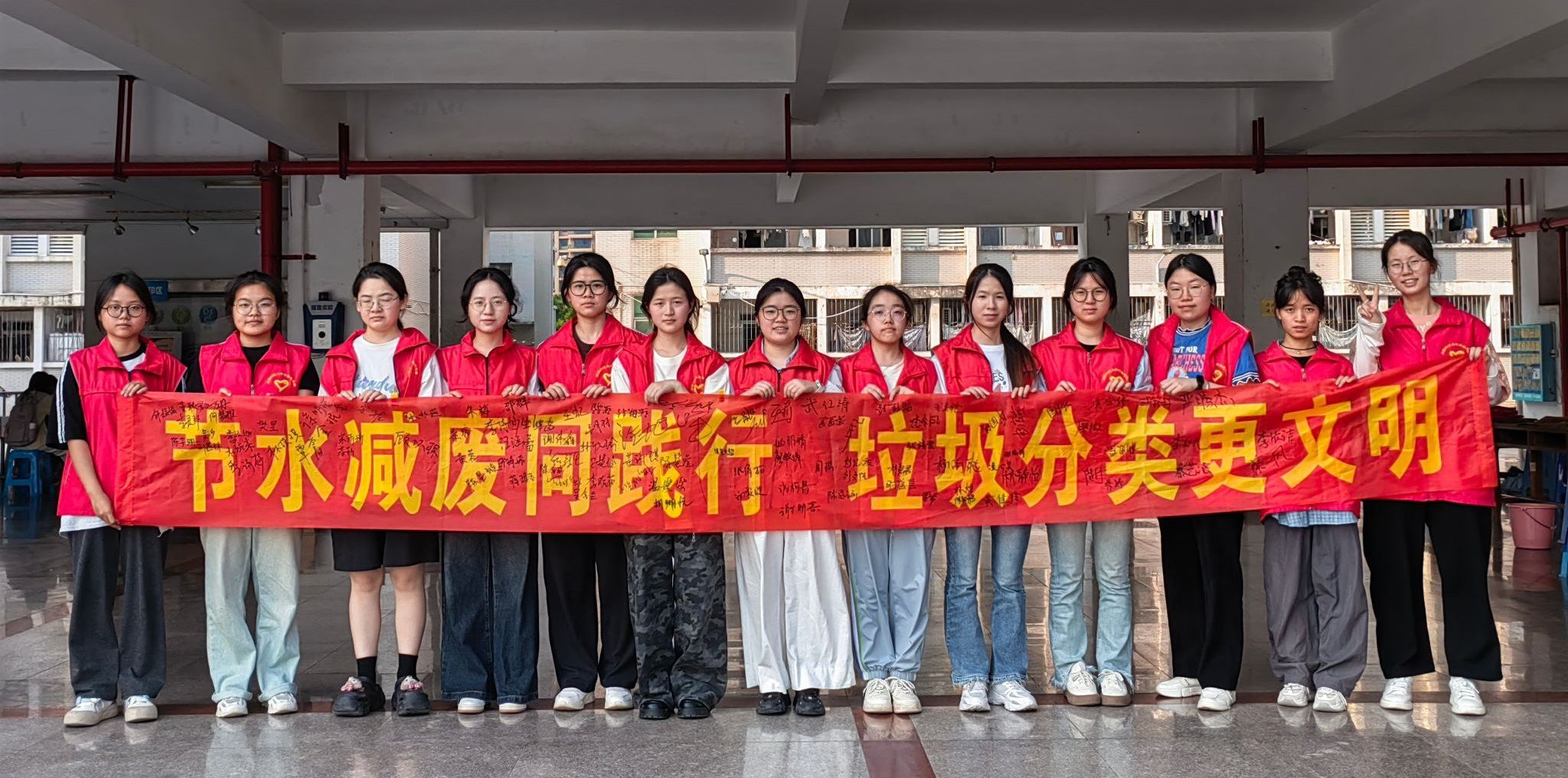 “节水减废同践行,垃圾分类更文明”——这条醒目的横幅上,密密麻麻地镌刻着师生们的郑重承诺。作为学院社区一站式平台的品牌活动,党员先锋宿舍率先垂范,以“红色先锋”引领“绿色风尚”。