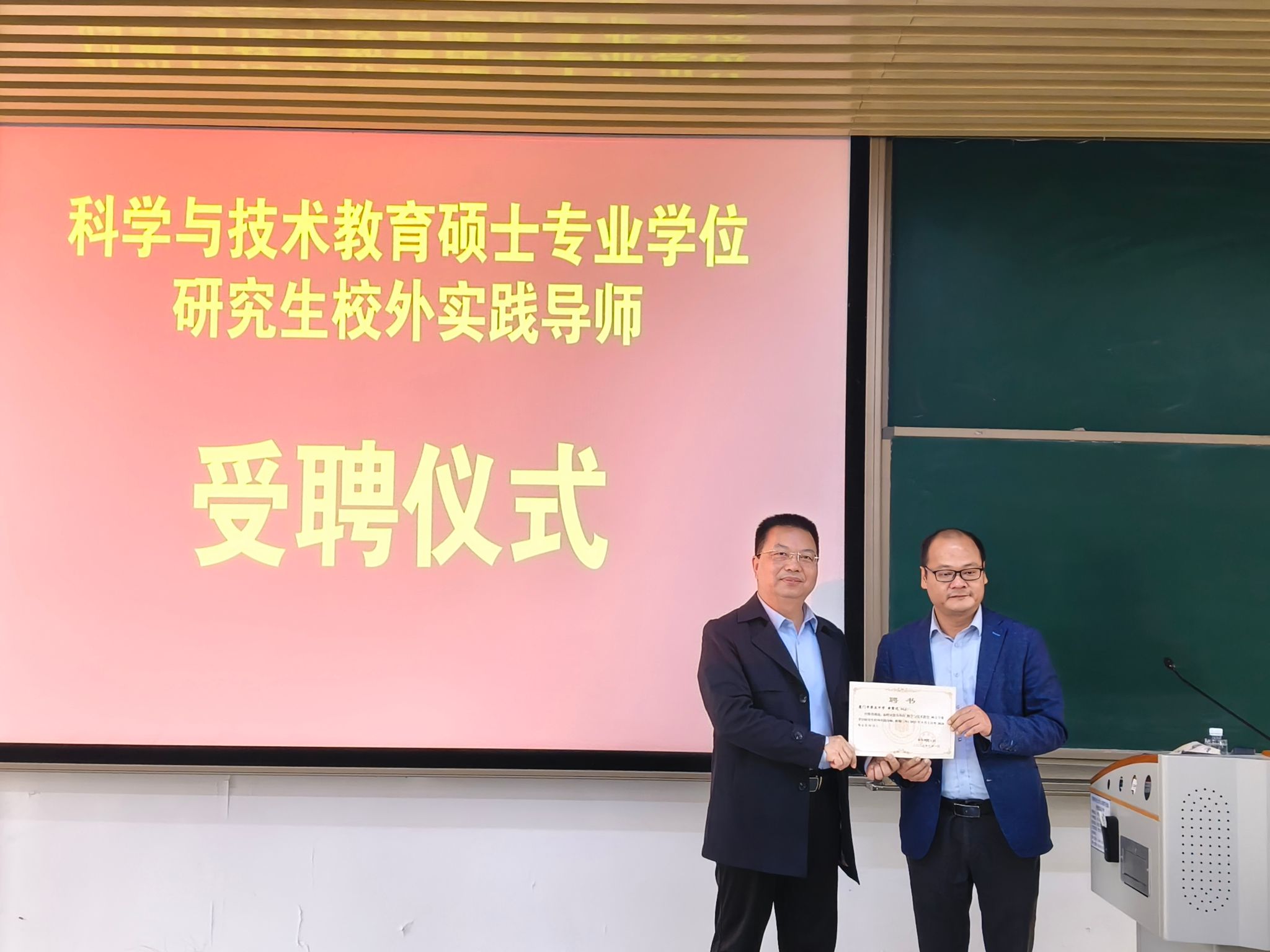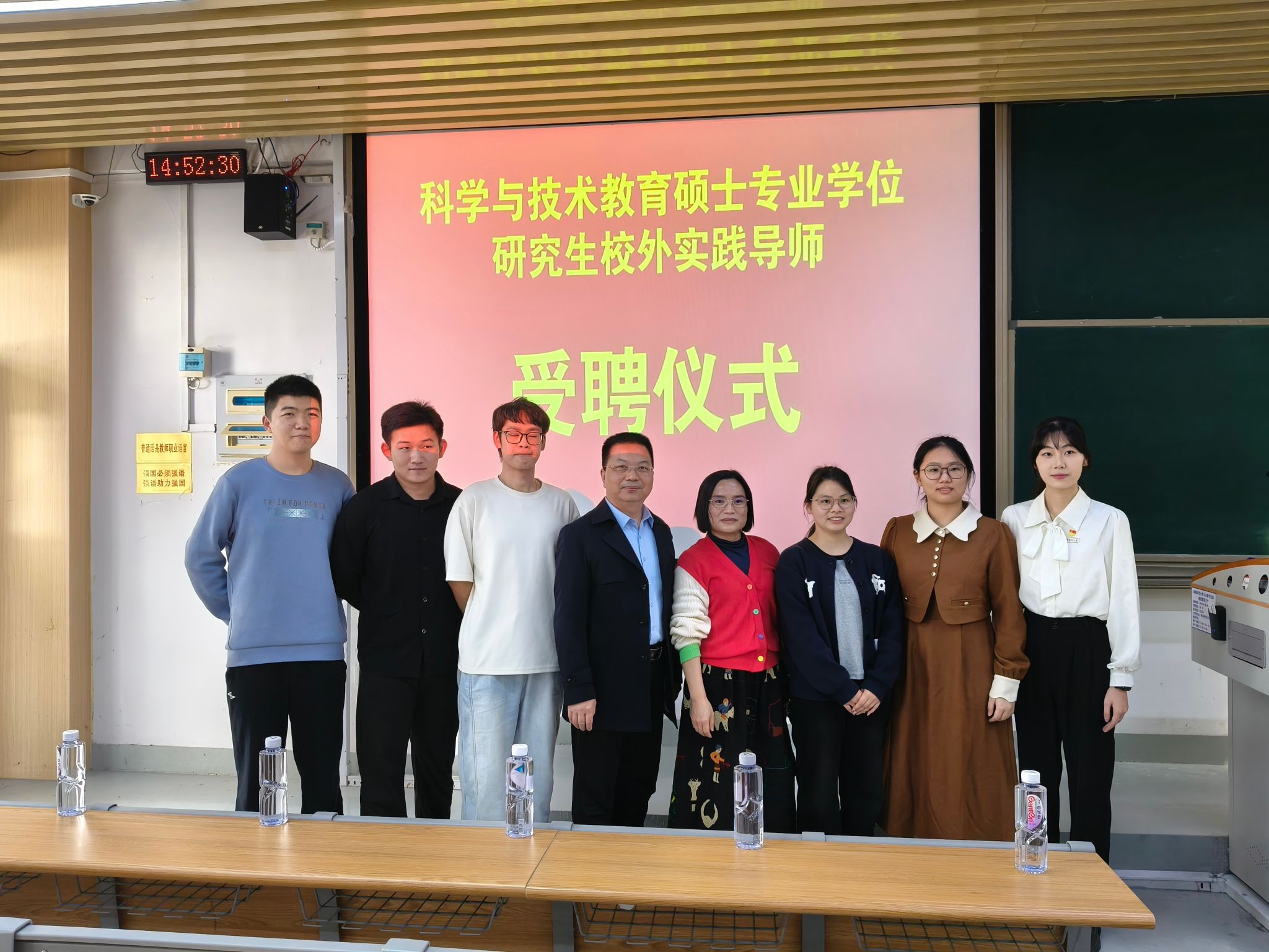 张茂升院长代表学院为黄鹭达老师颁发科学与技术教育专业学位研究生校外实践导师聘书。讲座结束后,黄鹭达老师与实习带队教师、实习生们合影留念。