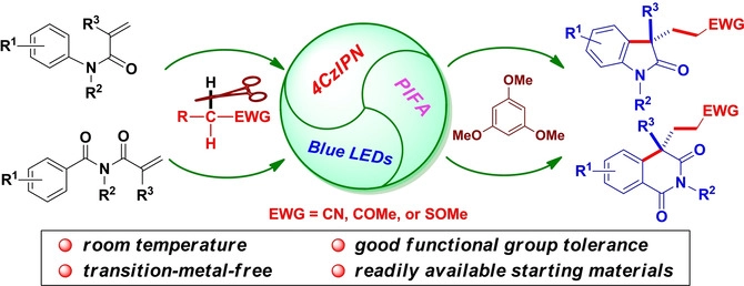 蔡顺有副教授课题组最近报道了一种新型的可见光催化N-芳基/芳甲酰基丙烯酰胺的氧化烷基化反应。在可见光催化的反应条件下,利用温和的二芳基碘鎓盐作为氧化剂,实现了不同取代基的N-芳基/苯甲酰基丙烯酰胺的芳基烷基化反应,制备出了一系列不同的多取代的吲哚酮及异喹啉二酮产物。该合成方法具有广阔的底物适用性、良好的官能团容忍性及温和的反应条件等显著的优点,为制备合成具有重要生物活性的含氮杂环类化合物提供了一种有效的合成方法。