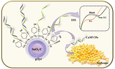 邱玮玮副教授通过将核壳结构SnO2-C复合物和聚酪氨酸制备成无机/有机杂化薄膜,利用该杂化膜作为电极修饰材料共价固定CaMV35S启动子基因探针片段的支撑平台,构建了花椰菜花叶病毒35S传感器。利用传感器表面聚酪氨酸的羟基基团与探针DNA的碱基形成氢键这一作用,使探针DNA覆盖在电极表面,导致高电化学阻抗,根据电化学阻抗的变化实现了严格依赖于杂交反应的“ signal-off ”的响应趋势,避免了CaMV35S检测时假阳性结果的产生。本研究通过理论计算预测了反应机理,并实现了对转基因大豆和非转基因大豆中提取的DNA样品的识别。