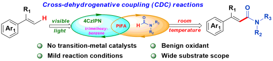 蔡顺有副教授课题组最近报道了一种可见光催化烯烃与二烷基甲酰胺的脱氢偶联反应。在可见光催化的反应条件下,利用温和的二芳基碘鎓盐作为氧化剂,实现了不同取代基的烯烃与二烷基甲酰胺的交叉氧化脱氢偶联反应,制备出了一系列不同的不饱和酰胺产物。该合成方法具有广阔的底物适用性、良好的官能团容忍性及温和的反应条件等优点。另外,利用该合成方法也可以方便地制备出抗菌试剂烯酰吗啉。