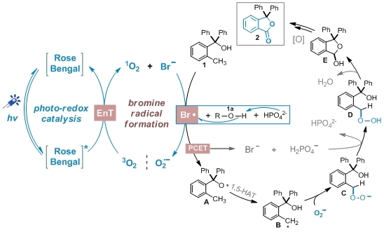 蔡顺有副教授课题组最近设计了一种通过质子耦合电子转移(PCET)策略实现了邻甲基苯甲醇上的C(sp3)-H键的选择性氧化内酯化反应。可见光照射下,以氧气作为最终氧化剂,在光催化剂有机染料玫瑰红与氢转移助剂(HAT)四丁基溴化铵的协同作用下,通过质子耦合电子转移的方式实现苯甲醇上O-H键的均裂,生成关键的烷氧自由基物种(A)。该烷氧基自由基通过1,5-氢迁移过程选择性地从苄基位置抽取一个氢原子,产生苄基自由基(B)。然后依次发生超氧负离子捕获、脱水、缩醛化以及氧化反应,获得最终的苯酞产物。这种方法无需强氧化剂或过渡金属催化剂的参与,具有反应条件温和、操作简便等优点,在有机合成领域具有广泛的应用前景。