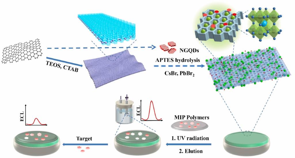 胶体CsPbX3(X=Cl,Br,I)钙钛矿纳米晶(PNC)是优秀的电化学发光(ECL)发射体,但由于PNC暴露于环境时具有高度吸湿性和化学不稳定性,其ECL应用受到限制。为了提高PNC的稳定性,许多工作致力于嵌入惰性基质或表面改性。一方面,SiO2固有的化学稳定性、高比表面积和可调孔隙率使其成为构建高耐久性纳米复合材料的理想载体。因此,许多研究人员致力于用SiO2稳定CsPbX3量子点。另一方面,碳量子点和石墨烯量子点(CQD和GQD)由于其优异的光学、电学和化学性能,在电化学发光(ECL)传感领域取得了巨大进展,特别是具有官能团(胺)的N掺杂GQD(NGQD)最近作为潜在的ECL共反应剂引起了大量关注。因此,预期具有足够胺的合适NGQD可作为挥发性和有害烷基胺的优异替代品,作为PNC的协同反应剂。