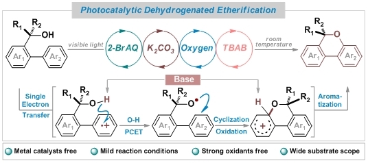 蔡顺有副教授课题组设计了一种可见光催化方法,实现了三级苄醇上的直接O-H活化反应,制备出一系列的官能团化的苯并吡喃类化合物。在氧气氛围中,以有机小分子2-溴蒽醌作为光敏剂,在外加碱碳酸钾的协助下,利用质子耦合电子转移(PCET)的策略,将稳定的羟基基团首先转化成高活性的氧自由基,随后再发生氧自由基加成、单电子氧化等后续的转化反应,最终生成了多取代的苯并吡喃产物。