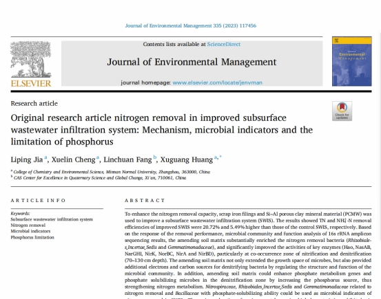 相关成果以Nitrogen removal in improved subsurface wastewater infiltration system: mechanism, microbial indicators and the limitation of phosphorus为题发表在国际著名期刊Journal of Environmental Management  上(中国科学院分区一区,IF=8.91335 (2023) 117456)。色色动漫 贾丽萍老师为该论文的第一作者,黄旭光教授为该论文的独立通讯作者。