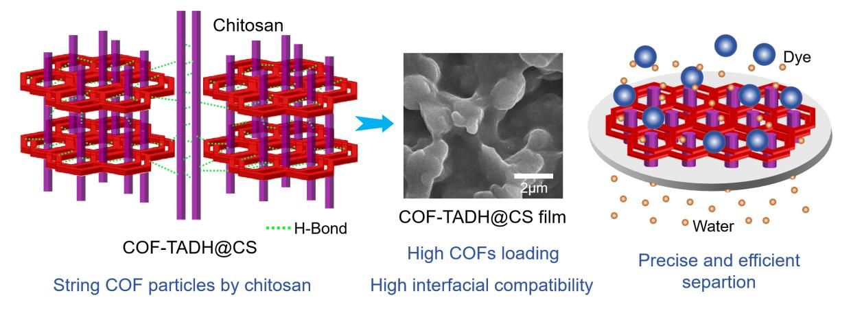 膜分离技术具有操作简单、能耗低、易扩展等优点,其纳滤技术已广泛应用于染料废水处理。目前,用于处理染料废水的商业膜主要是聚合物致密膜,然而聚合物膜很少具有规则和连续的通道,膜分离性能受到低扩散系数的限制。基于共价有机框架(COFs)的混合基质膜(MMMs)结合了可加工聚合物和有序多孔的优点,具有突破“选择性和渗透性互搏”的潜力。然而,控制相间界面相容性以制备高COFs负载的MMMs仍然是一个待解决的难题和面临的挑战。高COFs负载可以充分发挥COFs有序多孔的精确分子筛分优势。