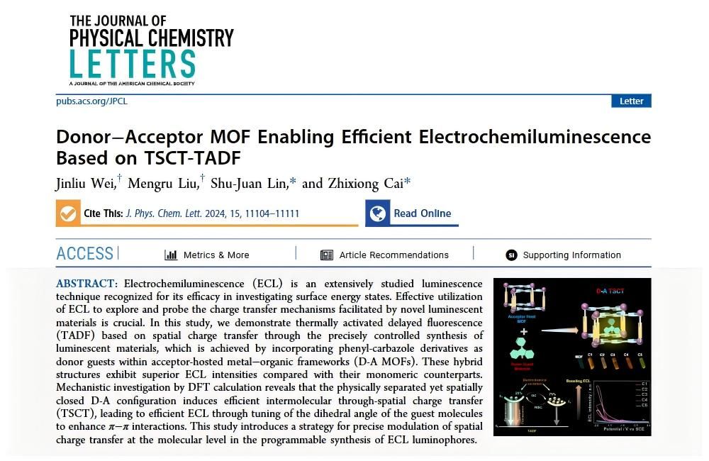 近日,蔡志雄课题组在利用热激活延迟荧光提升电化学发光研究方面取得新进展,相关成果以“Donor–Acceptor MOF Enabling Efficient Electrochemiluminescence Based on TSCT-TADF”为题,发表于物理化学领域权威期刊The Journal of Physical Chemistry Letters上(DOI: 10.1021/acs.jpclett.4c01967)。