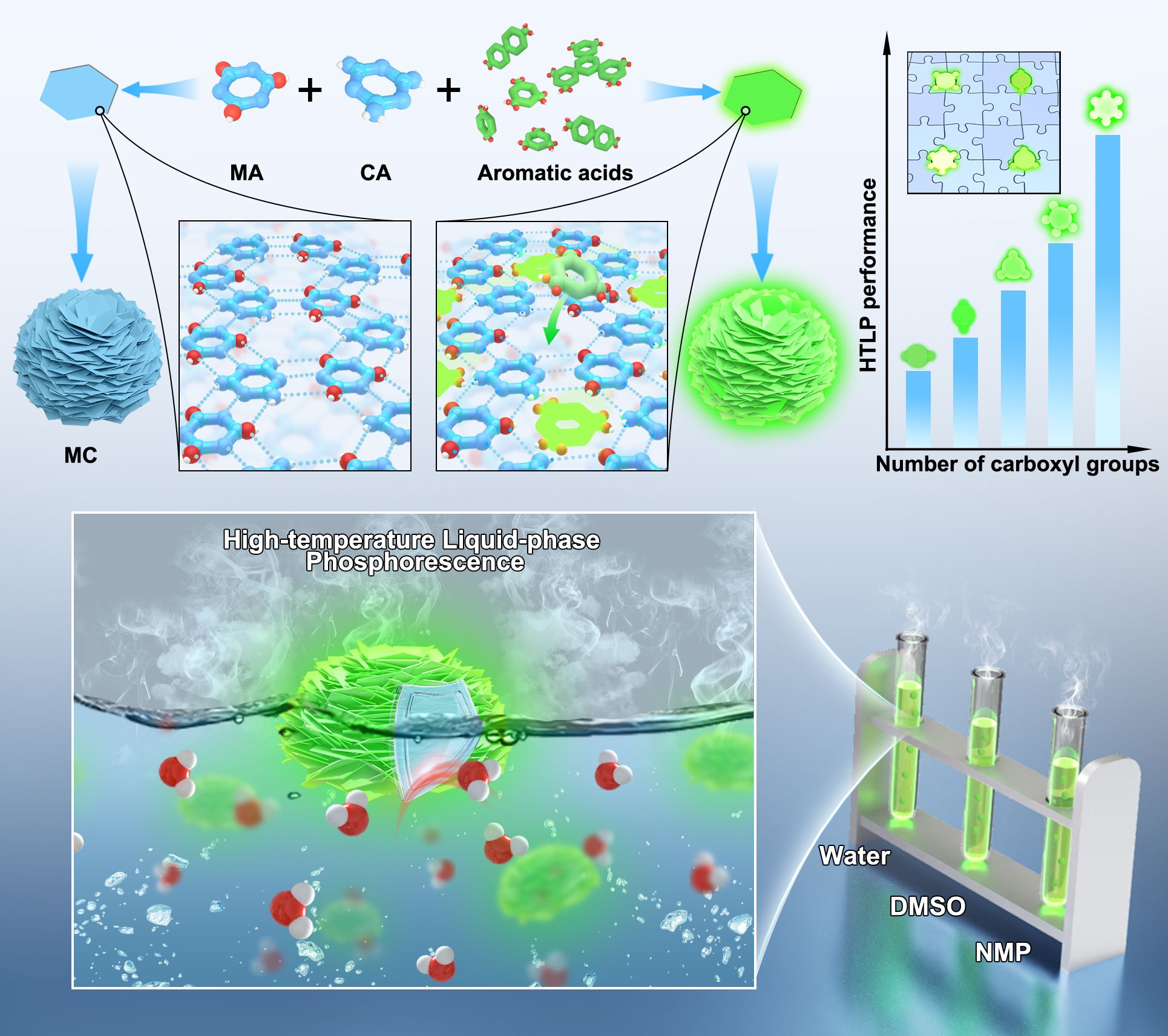 该研究通过超分子多价组装策略构建了一系列微纳结构的材料,用于固定有机磷光体,并在高温极性介质中稳定三重态激子,避免其发生湮灭,从而实现优异的高温液相磷光(HTLP)发射。这些多价模块包括芳香族羧酸(有机磷光体)、三聚氰胺(MA)和氰尿酸(CA),易于组装成高强度二维氢键超晶格结构。这些层状结构源自于二维氢键超晶格的石墨状堆叠。通过原位变温测试和理论模拟共同证明,该结构的分子网络和分子间相互作用在476 K时仍然稳定,为在恶劣条件下实现稳健的磷光发射提供了一种先进策略。