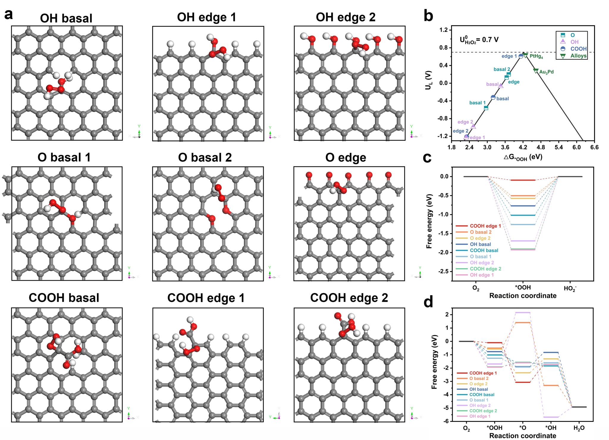 课题组采用水热水解改性策略,通过精准调控热处理温度和时间参数,在炭黑(Carbon Black, CB)表面构建了梯度分布的含氧官能团修饰层。通过EDS、XPS、Raman及接触角测试等表征手段发现,水热处理过程成功引入了羧基(-COOH)、羰基(C=O)和环氧基(C-O-C)等多种活性氧官能团,有效调控了催化剂表面电子结构,增强了氧物种的吸附活化能力。实验结果表明,经85℃水热反应6小时改性的CB-85-6h催化剂展现出最优的H2O2合成性能,达到3302.23 mmol·gcat⁻¹·h⁻¹的产率,且选择性高达90.1%,显示出显著的2电子氧还原反应(2e- ORR)路径选择性。理论分析与实验结果表明,表面氧官能团通过优化*OOH中间体的吸附自由能,有效降低了2e-反应路径的能垒。密度泛函理论(DFT)计算验证,位于石墨烯边缘的羧基官能团在调控电子转移过程中起关键作用,其独特的空间构型和电子特性显著提升了催化活性。该催化剂在连续10次循环测试中保持90%以上的初始活性,展现出优异的电化学稳定性。该研究通过表面官能团工程策略调节气泡—水/催化剂界面微环境,为开发高效稳定的H2O2绿色全合成提供了新的设计思路,同时为绿色化工合成技术发展开辟了创新路径。