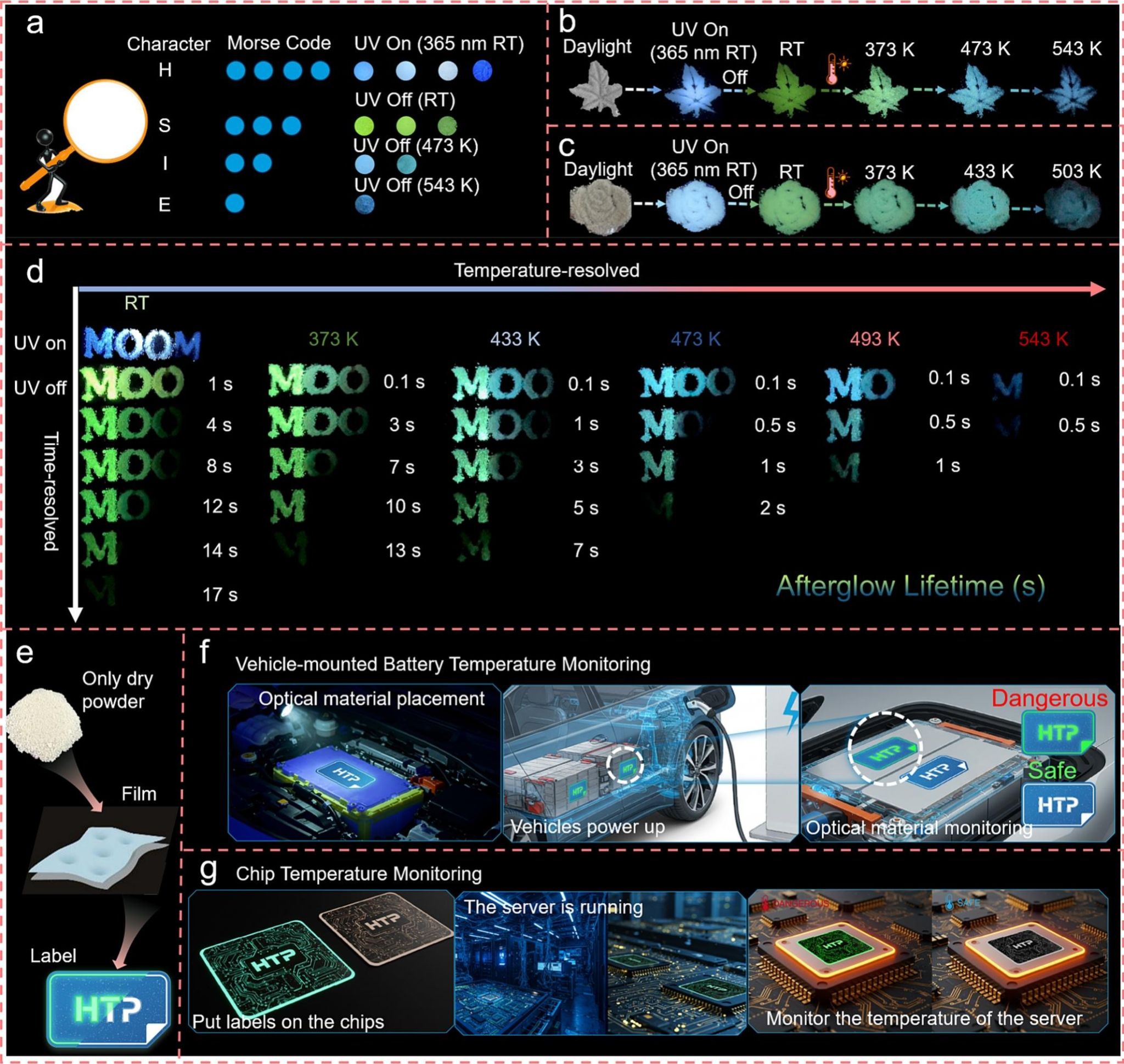 鉴于AMA@BO材料的稳定性和光学特性,进一步研究了它们在加密、防伪图案以及电动汽车电池和科技芯片温度监测方面的潜在应用。