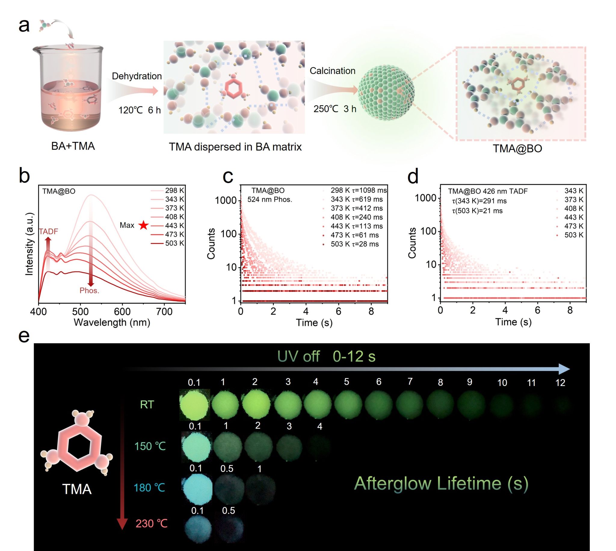 高温余辉(HTA)材料因其潜在的应用而备受关注。然而,三重激子极易受到热刺激,导致迅速失活,从而限制了有机余辉材料在高温下维持长时间余辉发射的能力。本研究提出了一种通用而有效的策略,即将芳香族羧酸(AMA)溶解在热硼酸(BA)溶液中,然后进行干燥和熔融脱水处理,成功合成了一系列 HTA 材料。硼酸基质提供了一个刚性和热稳定的环境,有效地限制了分子振动,防止了三重激子的非辐射转变。在这种 HTA 材料中,实现了三重热激子余辉(HEA)和热激活延迟荧光(TADF)双模发射,以及从蓝色到绿色的可调余辉颜色。这种合成策略不仅拓展了 HTA 材料在防伪领域的应用,还为电动汽车电池和服务器芯片的温度监测、防止设备热损伤提供了一种解决方案。