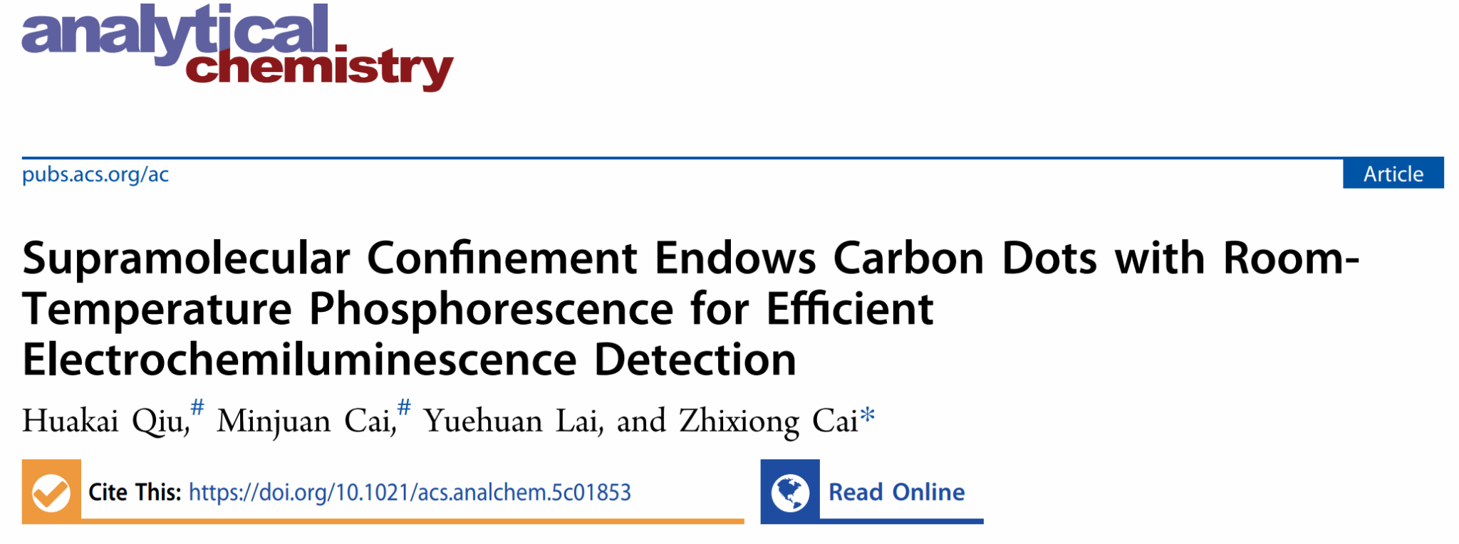 MOOM团队蔡志雄课题组在碳点基室温磷光材料用于高效电化学发光检测取得重要进展,相关研究成果以“Supramolecular Confinement Endow Carbon Dots with Room-temperature Phosphorescence for efficient Electrochemiluminescence Detection”为题发表在分析化学领域权威期刊《Analytical Chemistry》(中科院一区TOP期刊)上。
