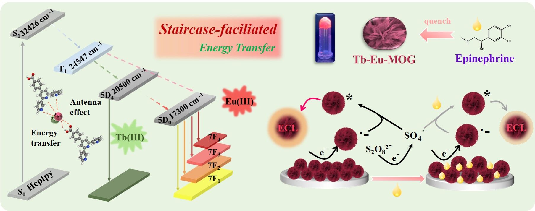 寻找新型、高效的电化学发光材料,是解决制约ECL发展瓶颈的关键。金属有机凝胶(MOG)是一种基于金属离子与有机配体相结合的多孔凝胶材料,具有合成条件温和快速、反应活性位点多、可调控性强等特点。鉴于MOG中心金属离子与配体之间的复杂能量转换关系,通过对MOG的电化学发光特性进行研究,有望获得新的ECL发光体并从分子水平阐释ECL的相关机理,进而构建生物分子灵敏的检测体系。课题组以Hcptpy为配体,通过一步混合法将Tb³⁺和铕Eu³⁺共掺杂,成功制备出具有独特花瓣状形貌的Tb-Eu-MOG。研究表明,Tb³⁺的掺杂为Hcptpy配体与Eu³⁺之间搭建了能量阶梯,这种“阶梯式能量转移”的方式显著提升了Tb-Eu-MOG的发光效率,信号强度较单金属MOG提升11倍以上。由于肾上腺素可竞争性消耗SO₄⁻.自由基并抑制激发态 Tb-Eu-MOG*的生成,由此可以实现EP的高灵敏检测。