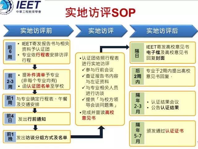 台湾IEET专业认证委员会的认证程序主要包括预备、审查与实地访评、作出认证决议3个阶段,含前期规划、自评自查、实地访评、结果处理及后续整改等4个环节。