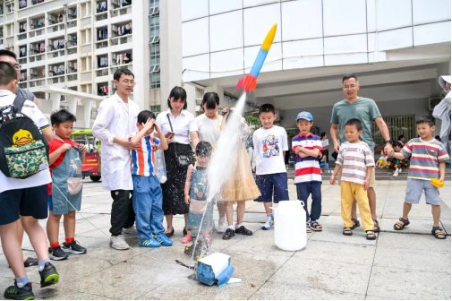 展示区的实验更是精彩纷呈。水火箭冲向云端的精彩,点亮了孩子们征途浩瀚宇宙的“航空梦”。