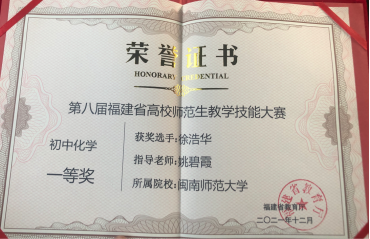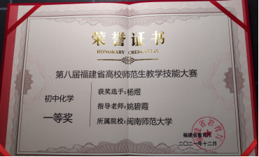 选派2名师范生参赛,与来自全省多所高校师范生展开激烈角逐,喜获佳绩。18级化学(师范)专业徐浩华、杨煜同学在姚碧霞老师的精心指导下,凭借优异的师范生技能和扎实的专业素质,在比赛中稳定发挥、表现出色,获得本次大赛初中化学组第一、二名的好成绩,包揽本次比赛两个“一等奖”,姚碧霞副教授获评“优秀指导老师”。