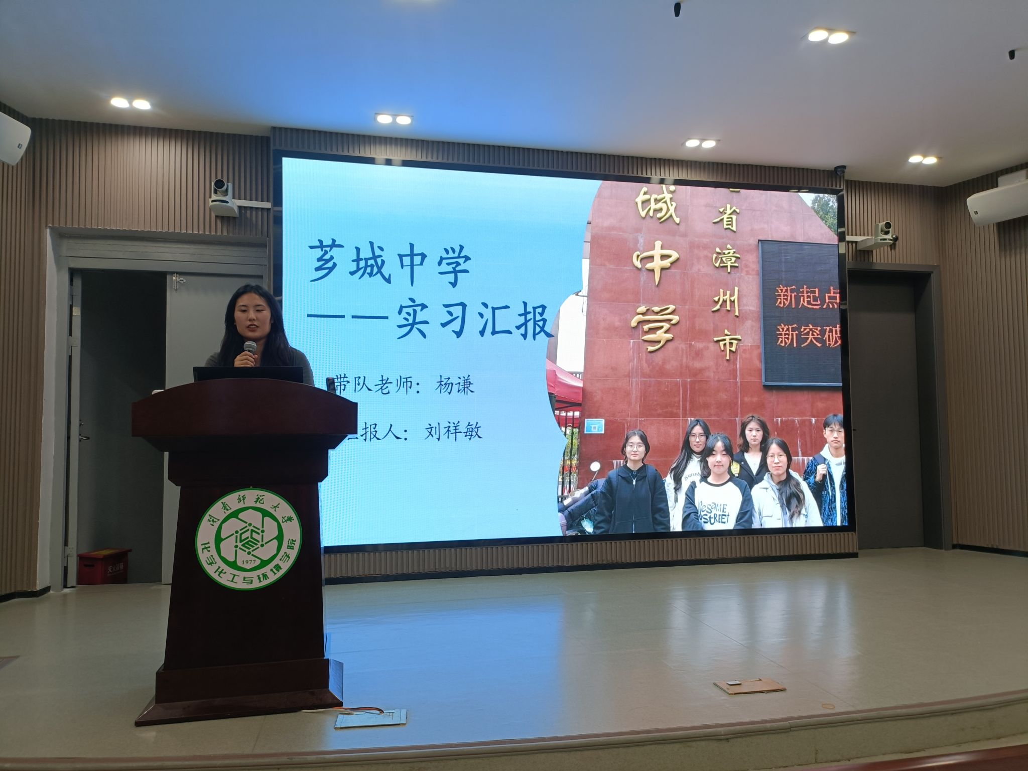 附属中学(漳州二中)和晋江毓英中学等实习队代表依次上台汇报了在各实习学校开展的听课、评课、备课、磨课、上课和督早读、晚自习、谈话谈心、家访、开展主题班会等班级管理工作;分享了实习中专业上的收获,以及与老师、学生和家长相处中的点滴感动。总结了实习中的不足,明确表示要继续不断学习提升教学技能与职业,努力做一名优秀的中学化学教师。每位汇报实习生课件设计精美,声音抑扬顿挫,内容充实丰富,令2023级学弟学妹受益匪浅。
